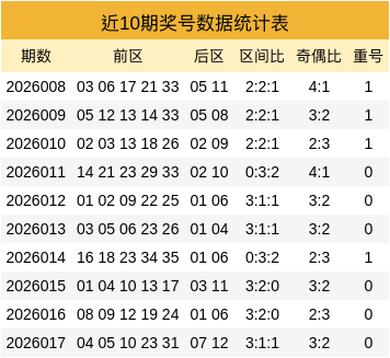 近10期前区的三区比为21:19:10,其中前1区出号数较多,3区前区出号数较少。上期前区三区比为3:1:1,1区前区表现较强。本期关注三区比2:1:2。