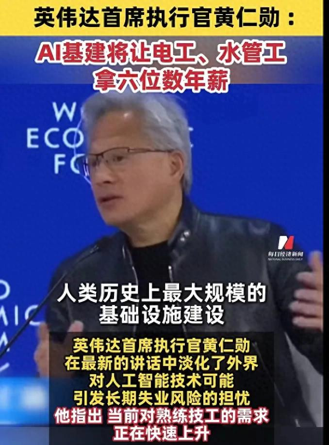 黄仁勋特别强调,水管工、电工和建筑工人将能拿到六位数年薪,而且这个趋势已经在显现,相关领域薪资几乎翻了一倍。