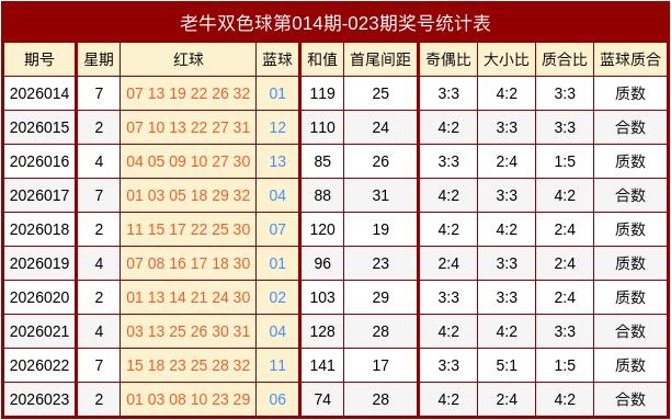 上期转头:双色球2026023期开出奖号:红球01、03、08、10、23、29,蓝球06。