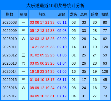 后区分析:在最近10期奖号数据中,后区号码的奇偶比为11:9,大小比为7:13。最近5期分别开出后一号码:01、01、03、01、07,平均值为2.60,后二号码:04、06、11、06、12,平均值为7.80,本期预计开出的后一号码会小于平均值,看好开出01,后二号码会小于平均值,看好开出06。