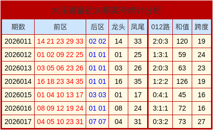 上期大乐透的开奖号码中,和值为73,跨度为27,012路比为0:3:2。